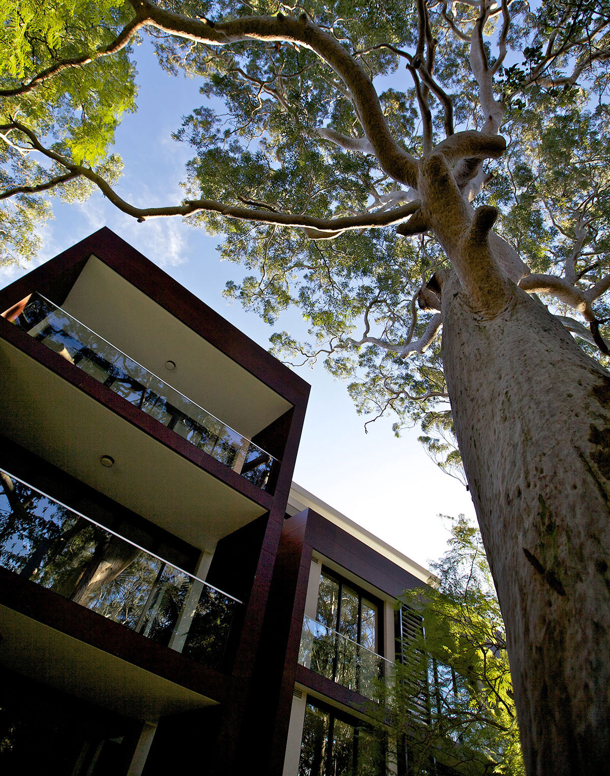 A striking design element of the Kings Apartments is the glazed circulation spine. This spine incorporates the lift and provides a light and airy access to each of the units, animating what would traditionally be an artificially light, enclosed environment. The spine is immediately identifiable from Kings Avenue and reinforces the address of the development. The glazed spine also contributes to the erosion of the built form by allowing direct lines of sight from the public domain to the established landscape located at the rear of the site. These lines of sight, in essence, reinforce the site's landscape as the dominant natural feature of the site.